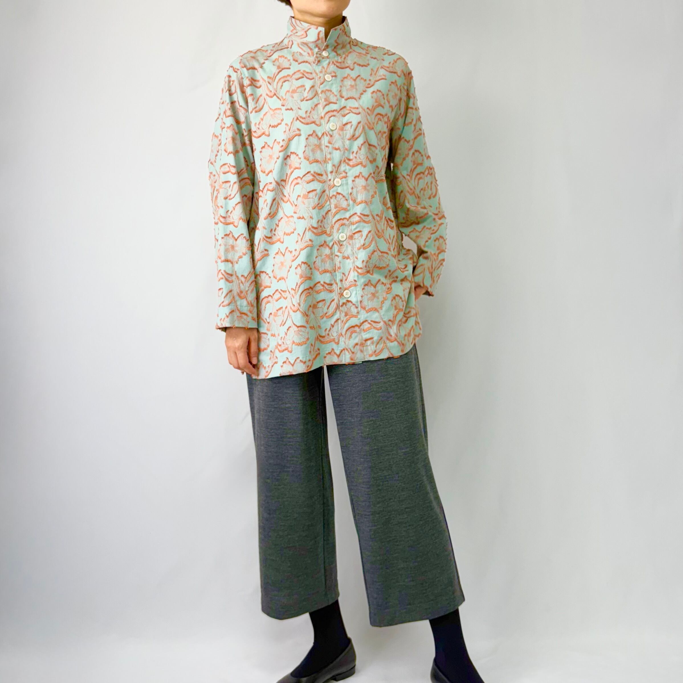 綿100%生地にポリエステルの糸でフラワー柄を織り込んだカットジャカード。ベースが綿なので肌触り良く、軽い仕上がりです。