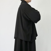 ボタン留めの無いストールのようなカーデ。和服の合わせのような前端の直線カッティングは、胸元をすっきり見せてくれます。