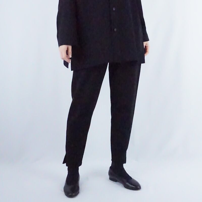 両脇スリットが余った裾を甲に流すので、小柄の方でも足首がもたつきません。