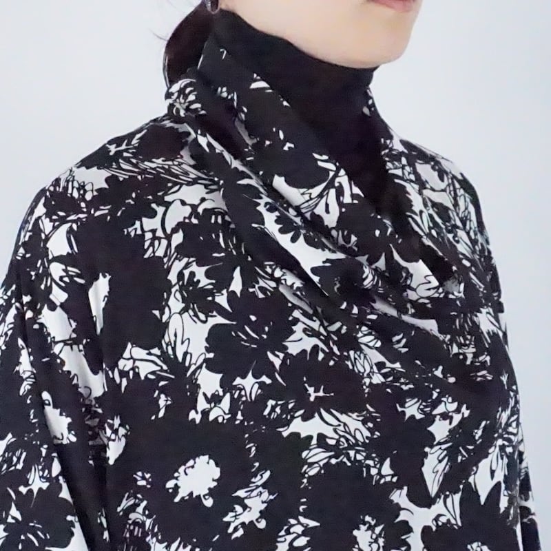 V字切替により首から胸元の収まりがよく、衿元のボタンを留めてドレープハイネックに、外すとルーズネックにと表情を変えて着こなせます。