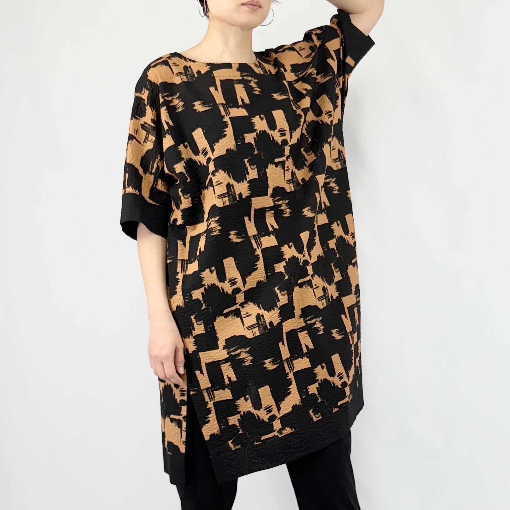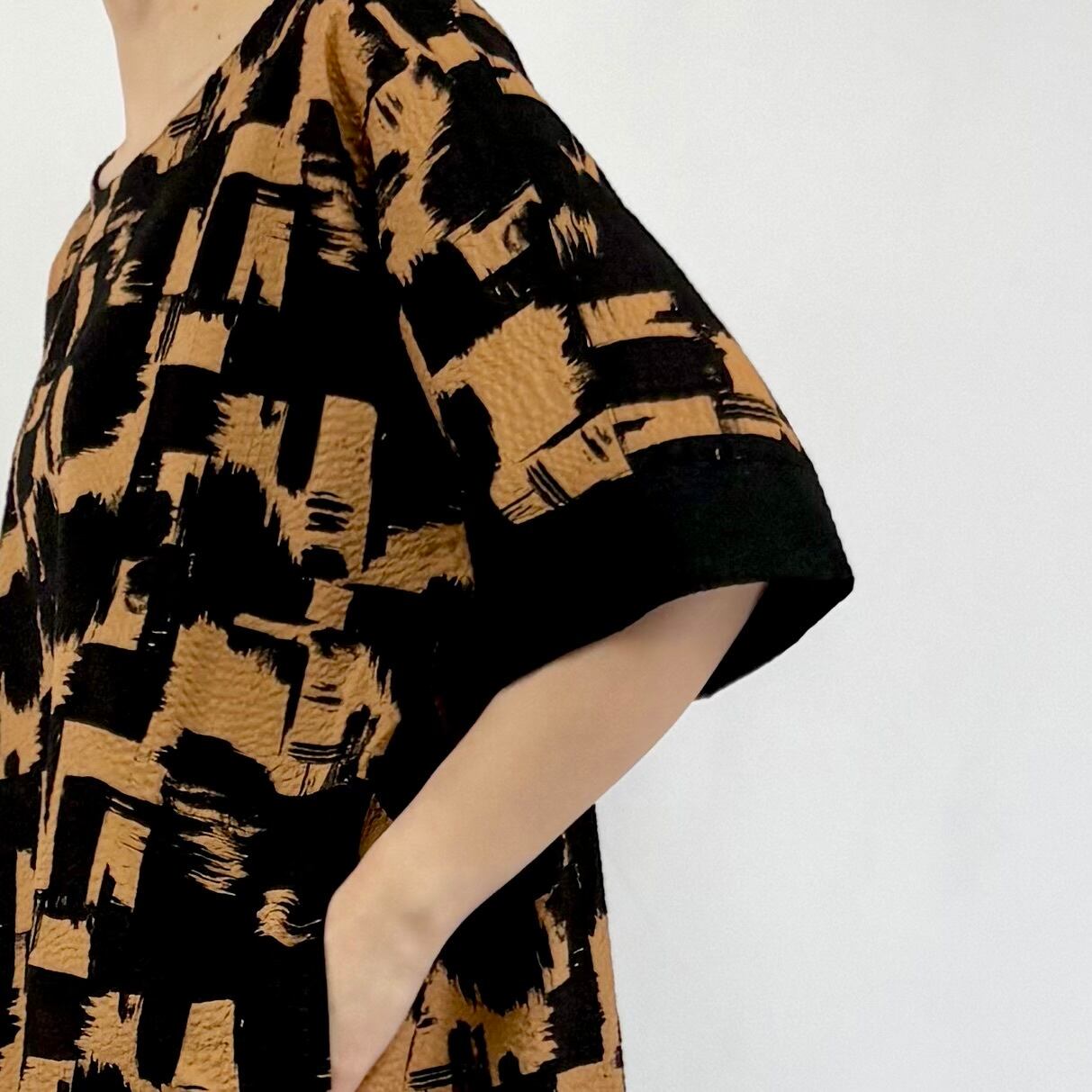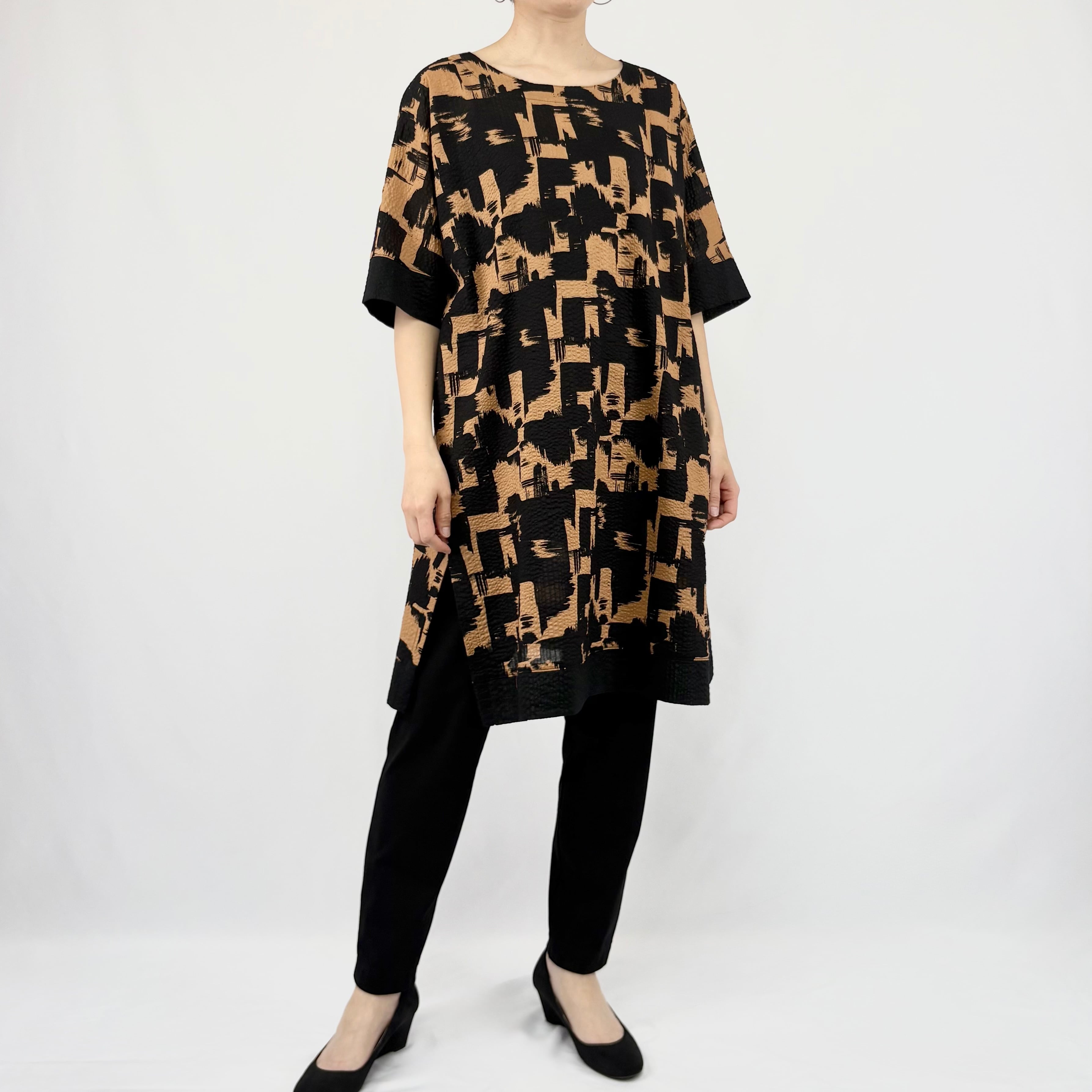 ハケで墨を塗ったようなダイナミックな柄のプリントを、クロ無地切り替えでシックにまとめています。