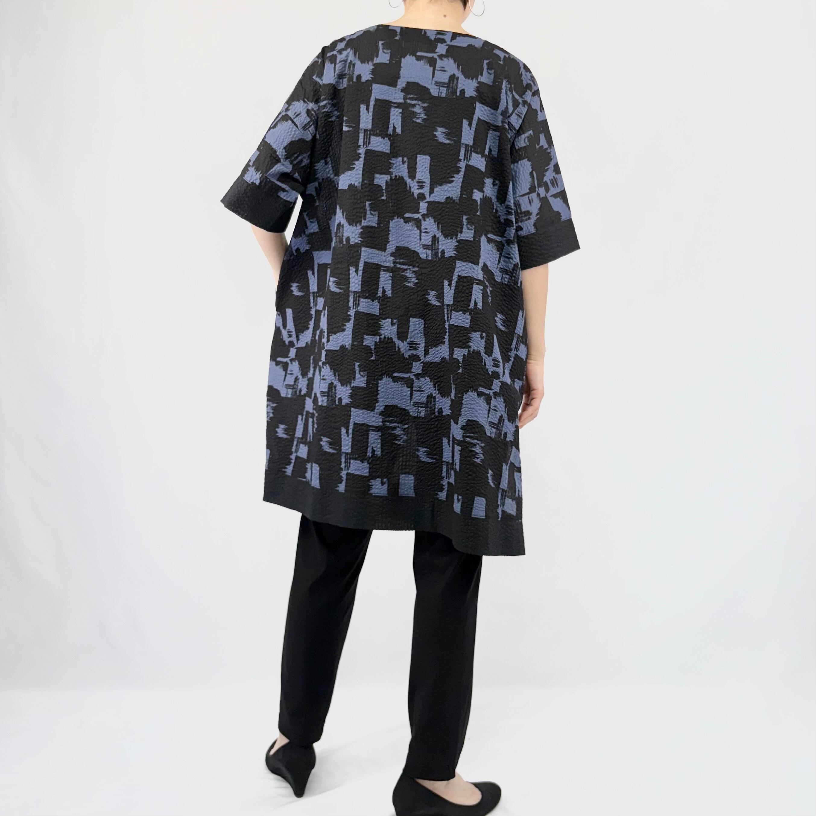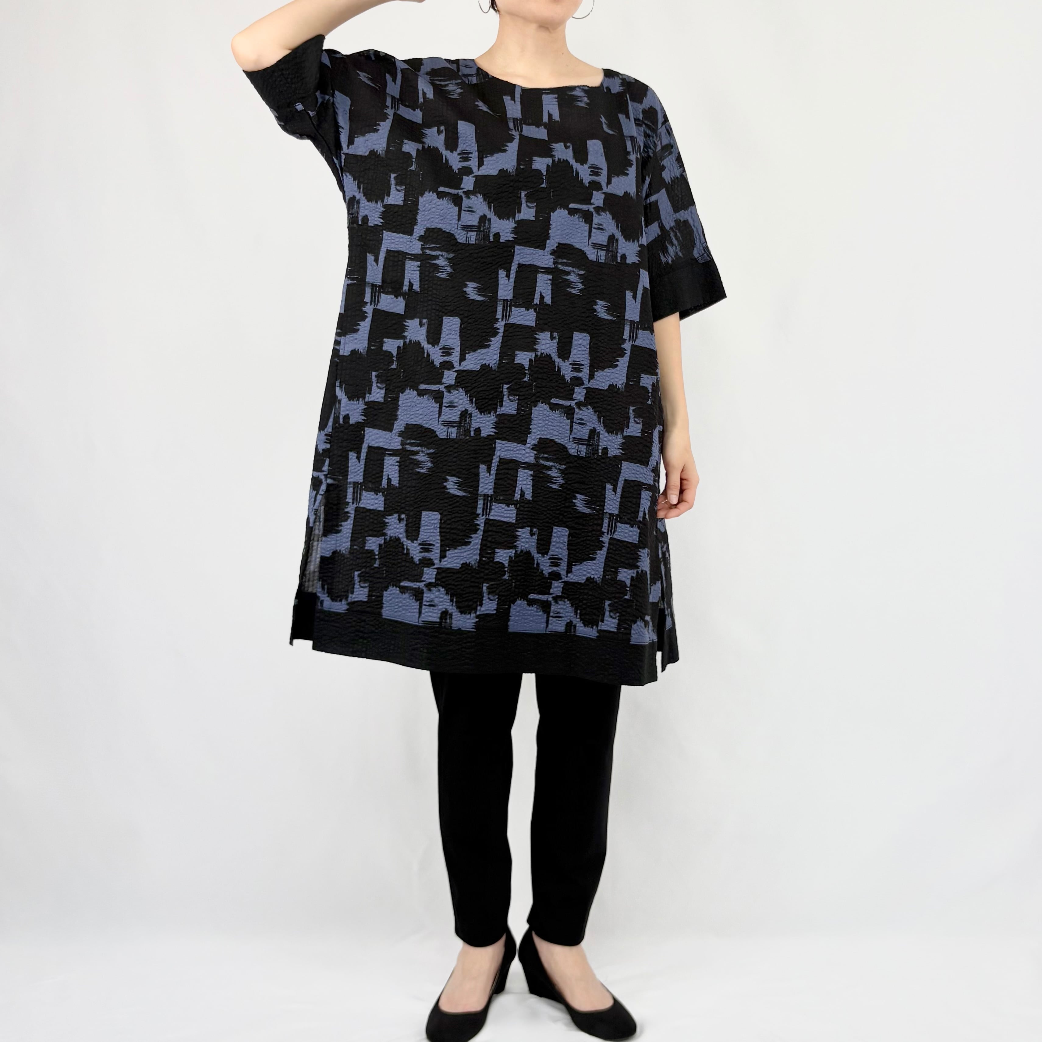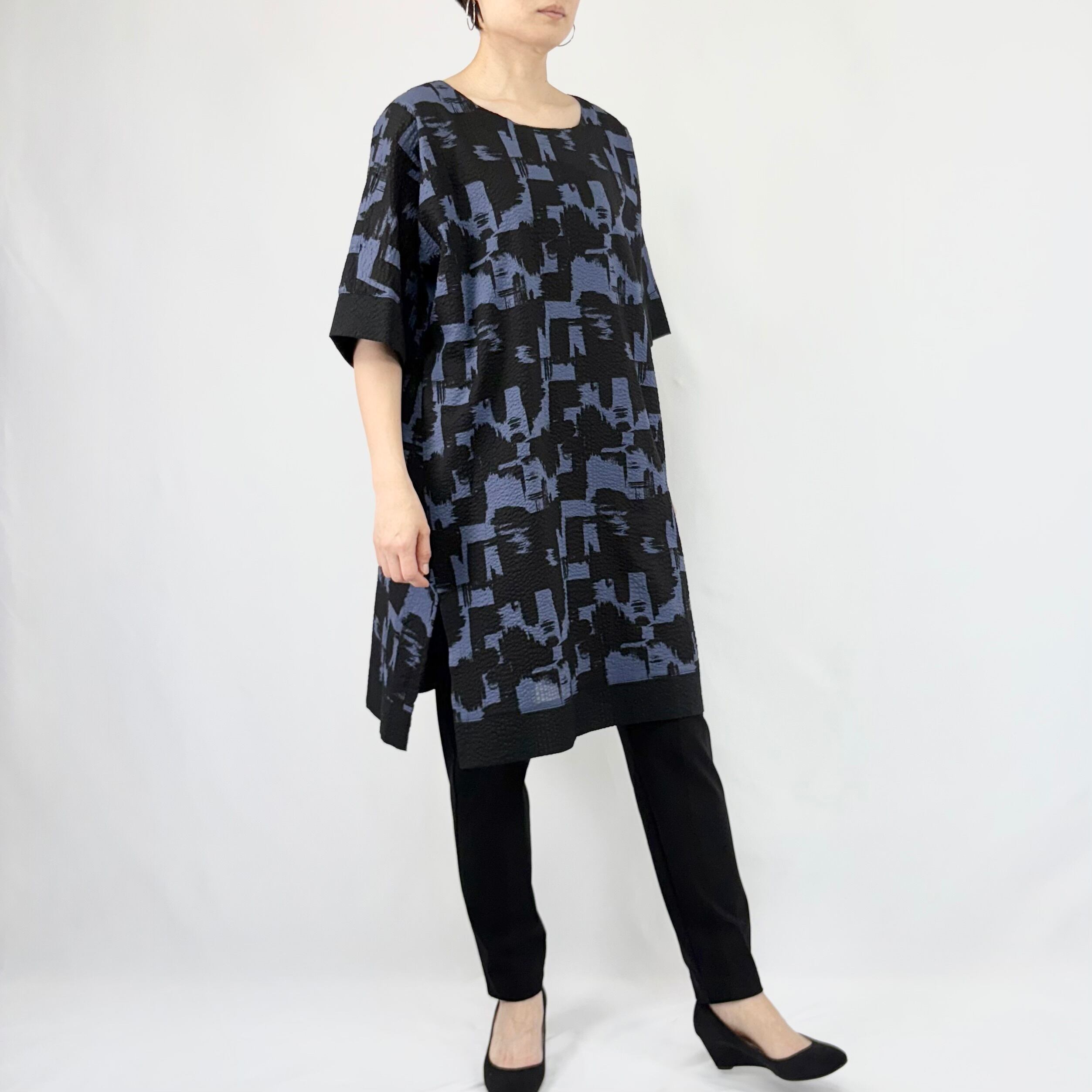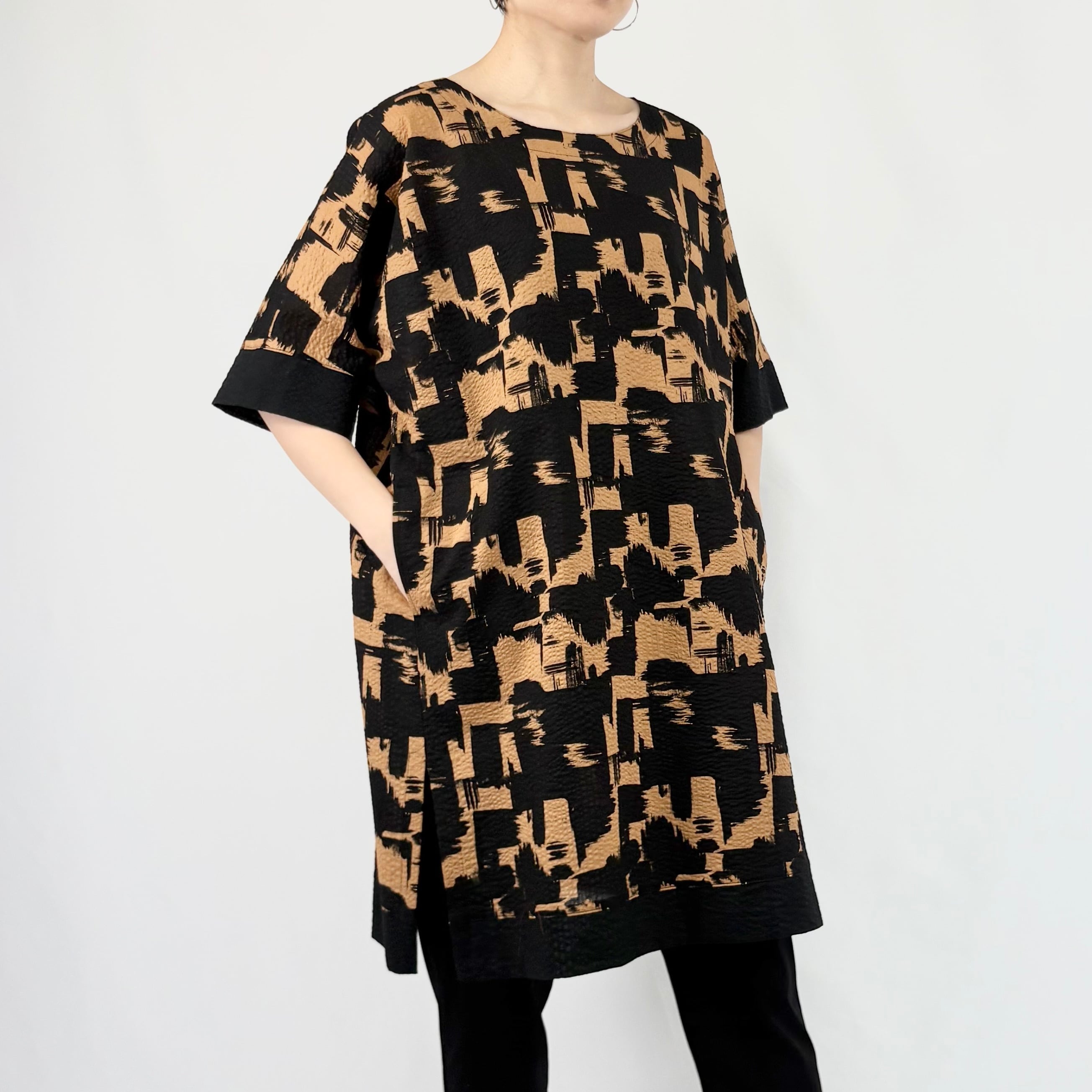 ハケで墨を塗ったようなダイナミックな柄のプリントを、クロ無地切り替えでシックにまとめています。