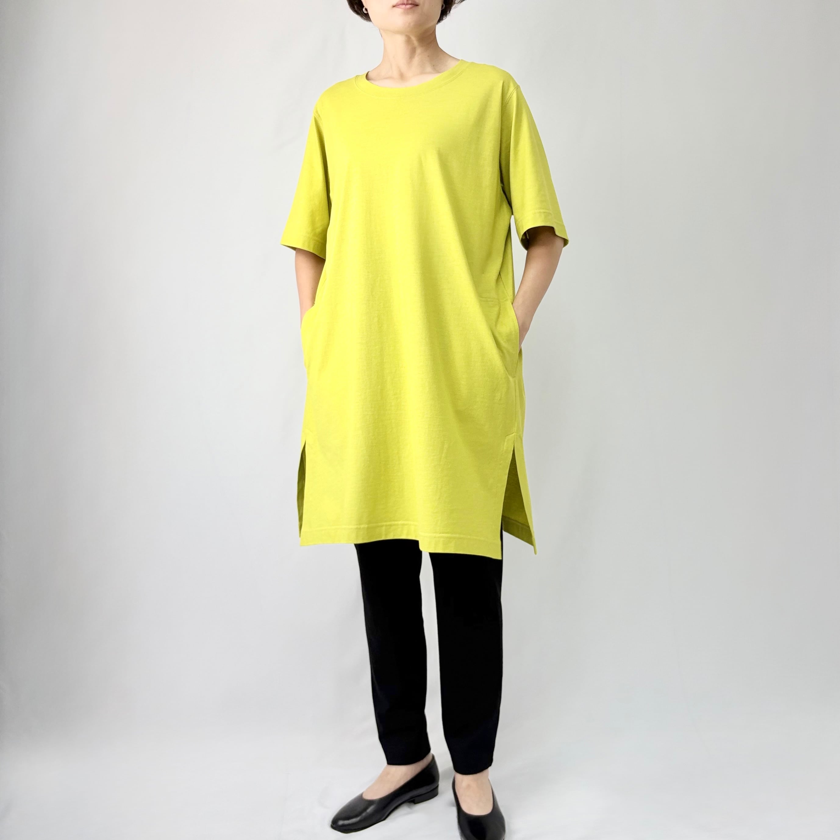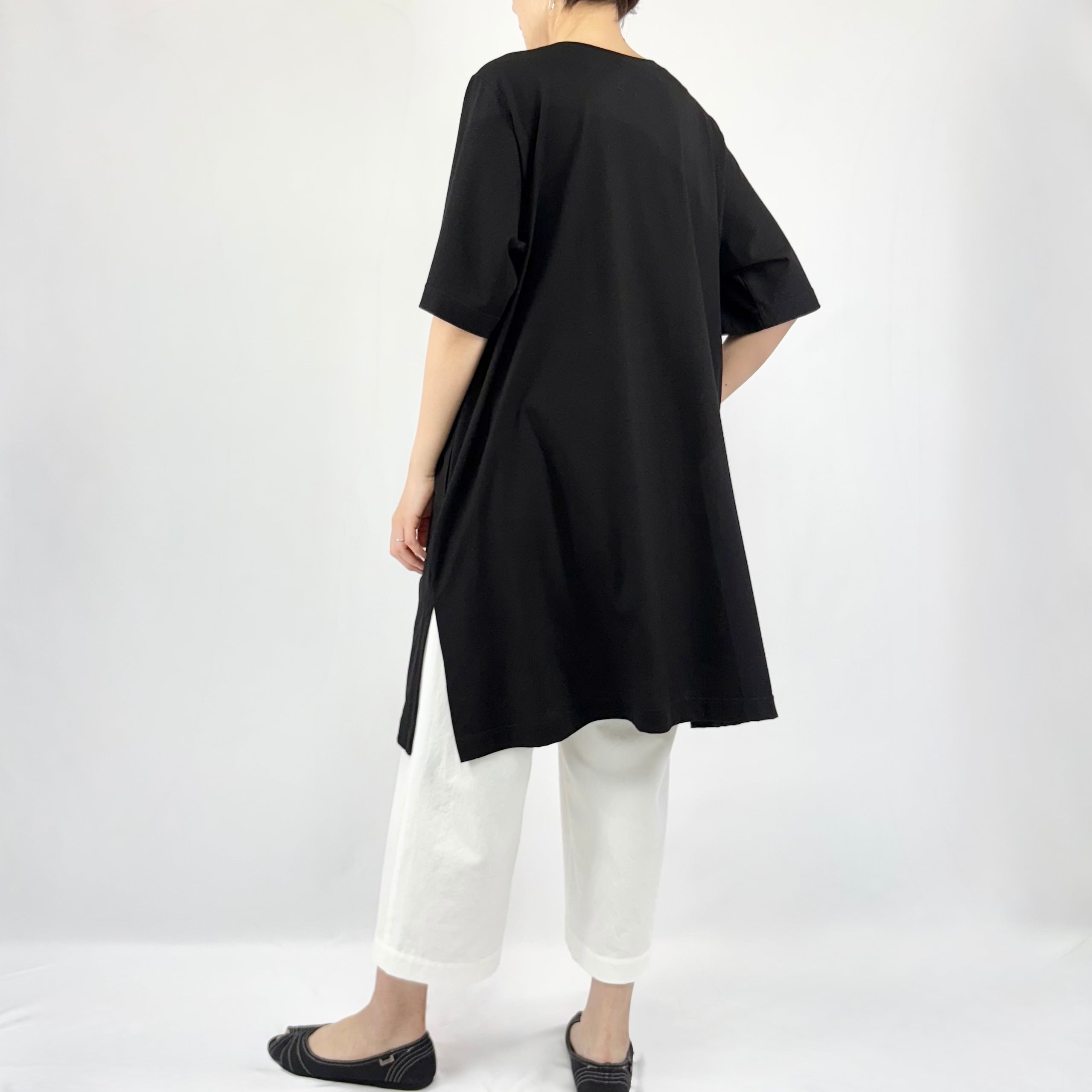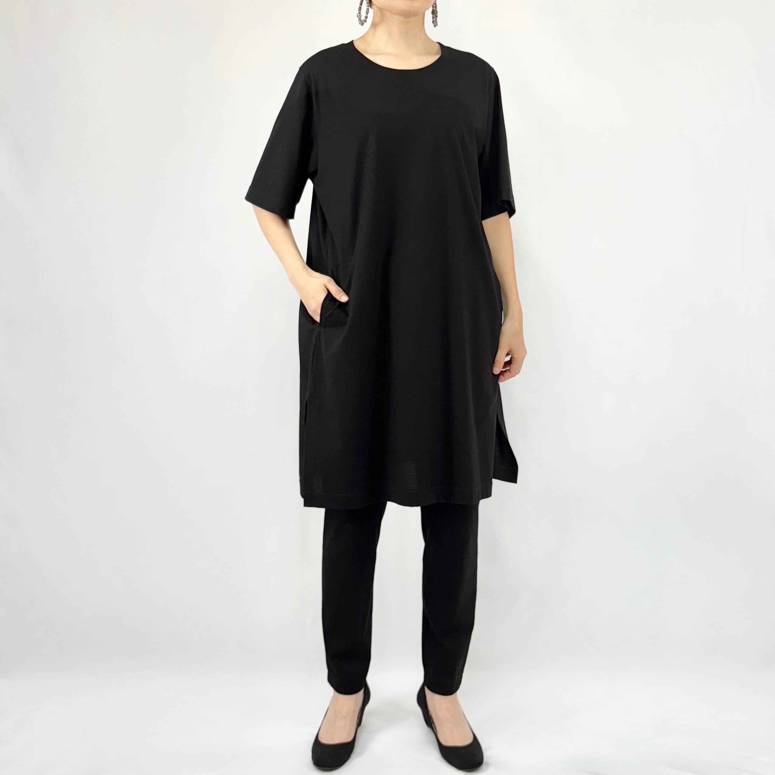 チュニック丈は気になるウエストから太ももまでをすっぽりと隠してくれるのでスタイル良く見え、左右に入ったスリットで裾まわりが軽快です。